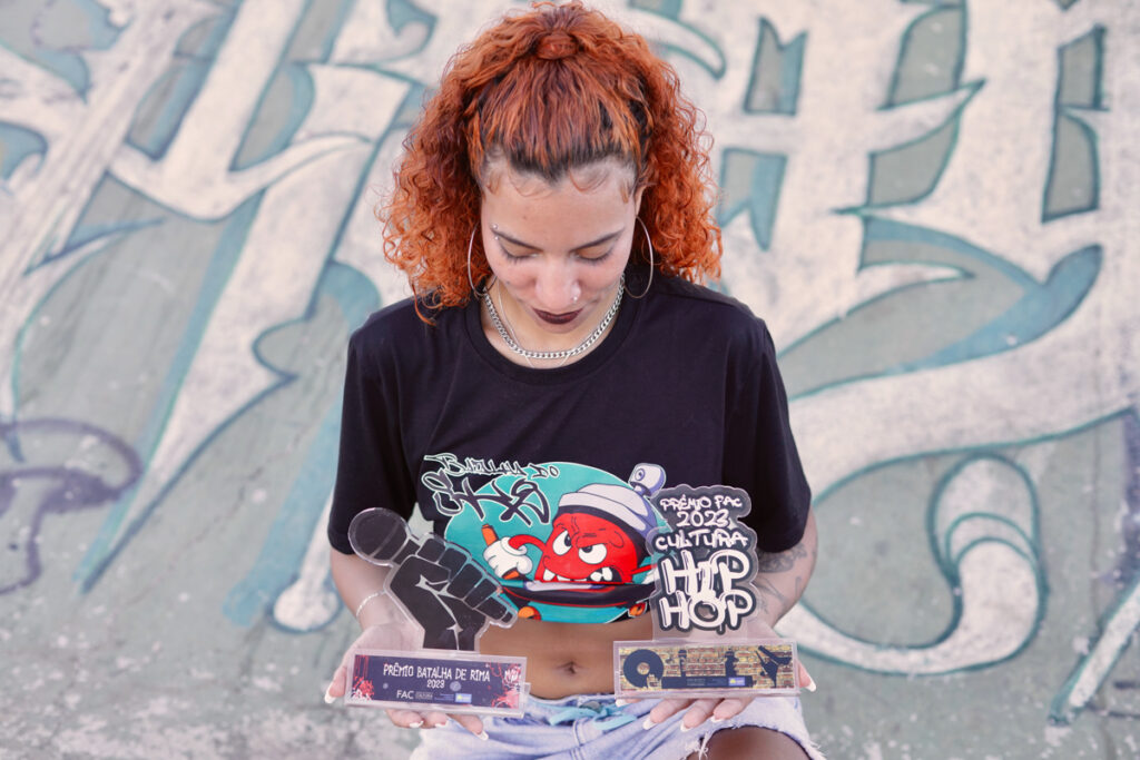 “Dito e certo. Ganhei e comecei a colar toda terça-feira na pista de skate para conhecer melhor a parada e tudo foi acontecendo até assumir a organização”, explica. Essa vitória foi um divisor na vida de O´hara e de todas as O´haras que se sentiram encorajadas a seguir essa trilha. Lidar com o machismo no universo das batalhas foi um dos maiores desafios. Motivada pela avó, não recuou diante do preconceito e abriu frente para muitas outras garotas ou b-girls. “Eu era a única mina e tinha muito medo. Dali em diante, me transformei. Sou da época em que nós, mulheres, não tínhamos vaga garantida. A gente ia para o sorteio, se não fosse sorteada, não rimava”, lembra. Hoje, as mulheres têm mais liberdade e vaga garantida nas batalhas.